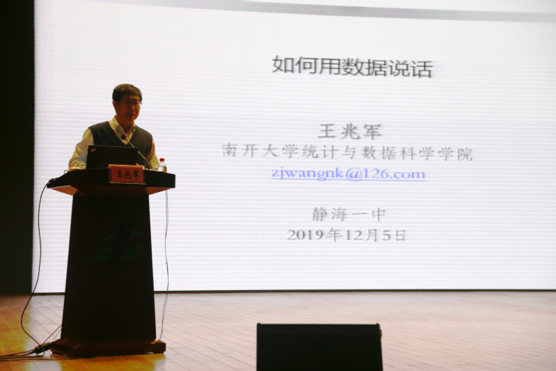 随后,王兆军院长为静海一中的师生进行了题为“如何用数据说话”的科普讲座,以生动详实的案例介绍了统计学的学科特点、污漫