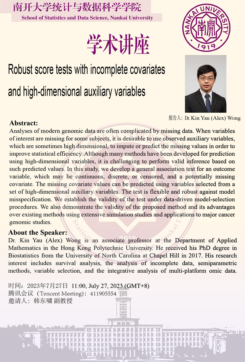 Robust score tests with incomplete covariates and high-dimensional auxiliary variables (Kin Yau Wong)