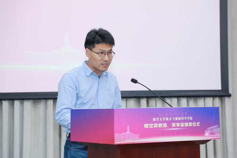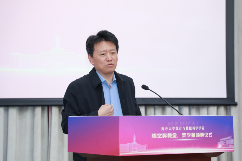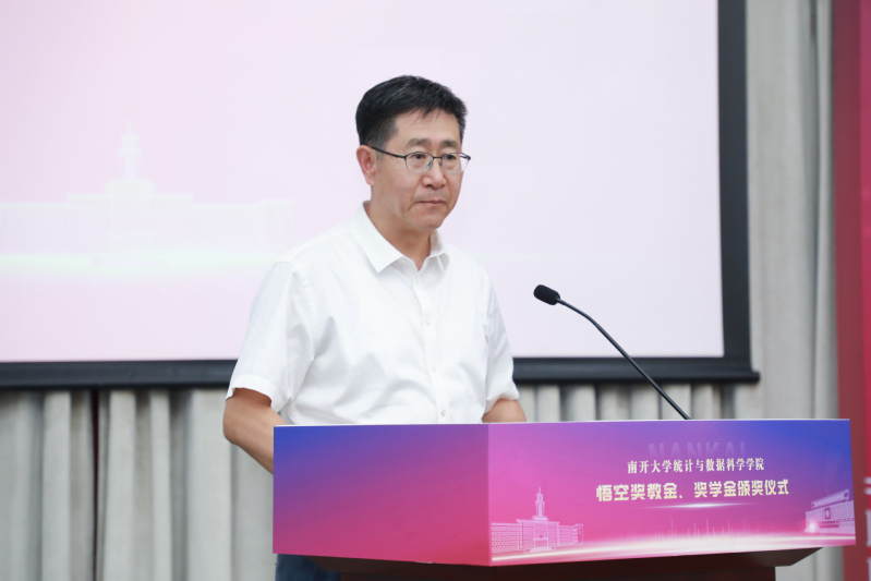 奖教金、奖学金捐赠方悟空投资管理有限公司董事长鲍际刚首先发表讲话。在讲话中,他回忆了在南开读书的时光,强调在南开求学的这些年是他人生事业的重要起点。同时,他非常感谢学院领导为他与学校之间架设的合作交流的桥梁,让他能够有机会回报母校、服务南开师生。最后,他希望悟空奖教金、奖学金能够助力母校发展,助力统计学科发展,同时也期待未来有更多的同学能够学有所成,铭记母校,反哺南开。