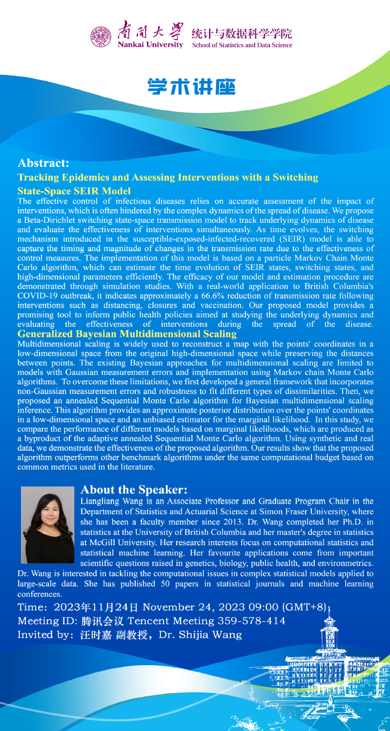 Tracking Epidemics and Assessing Interventions with a Switching State-Space SEIR Model & Generalized Bayesian Multidimensional Scaling (Liangliang Wang)