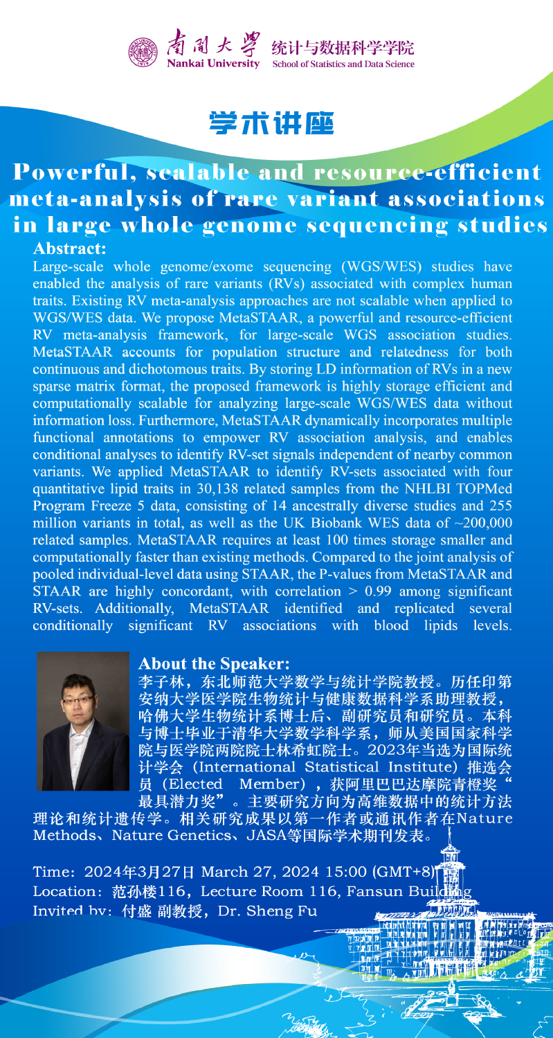Powerful, scalable and resource-efficient meta-analysis of rare variant associations in large whole genome sequencing studies(李子林)
