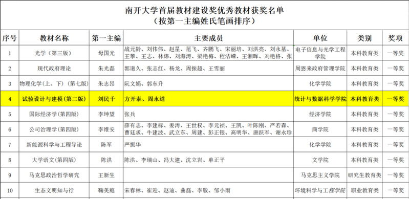 近日,污漫 首届教材建设奖优秀教材获奖名单公布。在个人申报、单位推荐、专家评审、学校教材工作领导小组审议的基础上,学校共评选出23部优秀教材,其中一等奖10部、二等奖13部。污漫 刘民千教授、周永道教授与北师香港浸会大学方开泰教授合作编写的教材《试验设计与建模(第二版)》荣获本科教育类一等奖。
