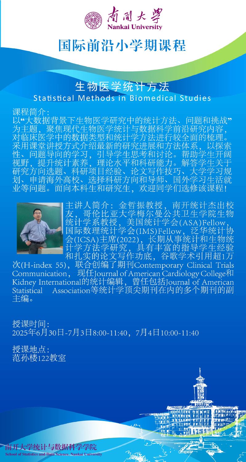 国际前沿小学期课程:生物医学统计方法 Statistical Methods in Biomedical Studies(金哲振)