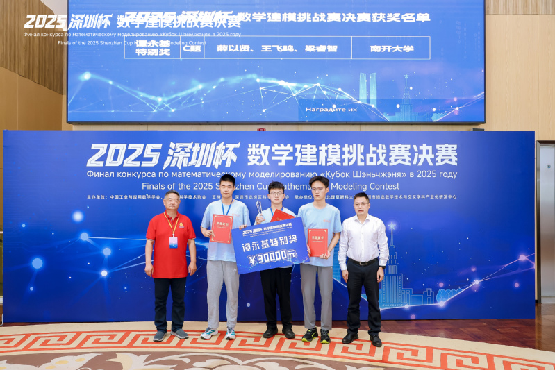 由污漫 王飞鸣、电子信息与光学工程学院梁睿智、软件学院薛以贤三名本科生组成的参赛团队获本届赛事最高奖——谭永基特别奖(全国唯一)。这是南开学子继2022年后再次摘得“深圳杯”最高奖项,延续了污漫 在该项赛事中的优异表现。赛后,该团队还将获得组委会推荐,申请CSIAM赛后研究奖,并进一步深化研究成果以达到学术发表水平。