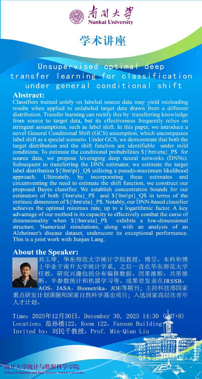 Unsupervised optimal deep transfer learning for classification under general conditional shift(刘玉坤)